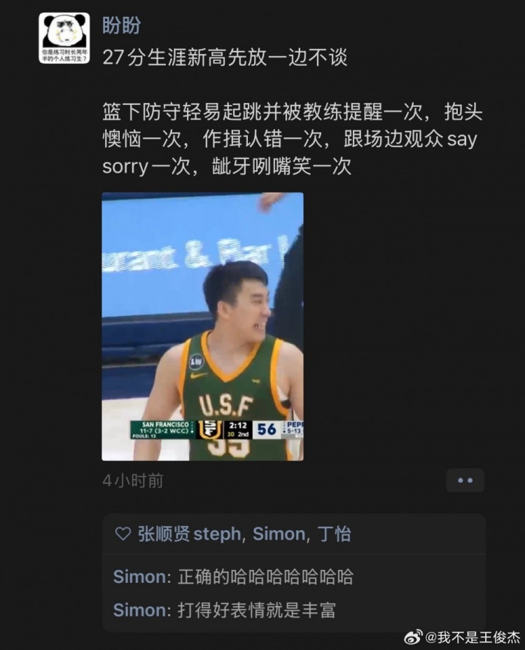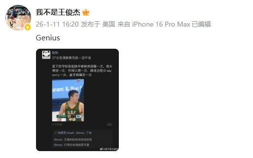 海星直播-重回首发砍新高27分!王俊杰转发调侃自己的言论并配文:天才